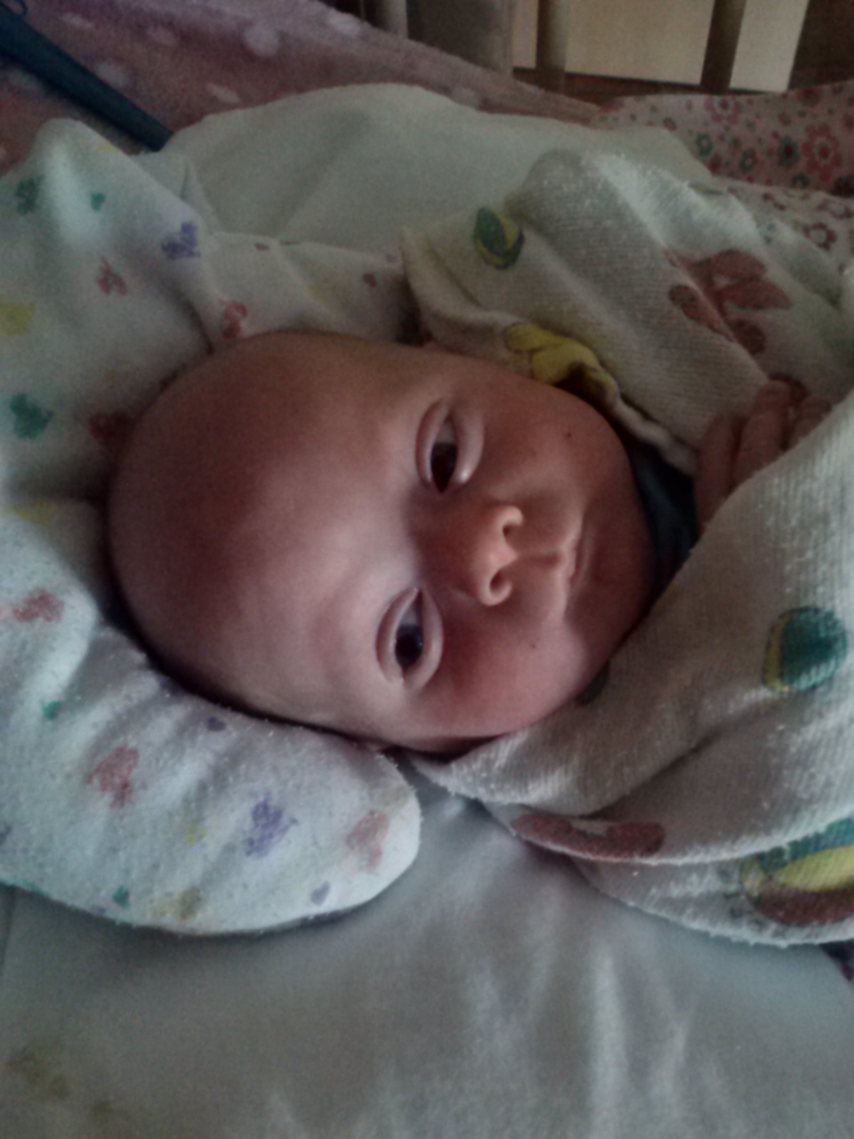 Natasha is up to 2.85 kg (6lb 4oz) and I think it is all going into her head, because that just keeps getting bigger and bigger. Here is a photo, burrito mode on the left.